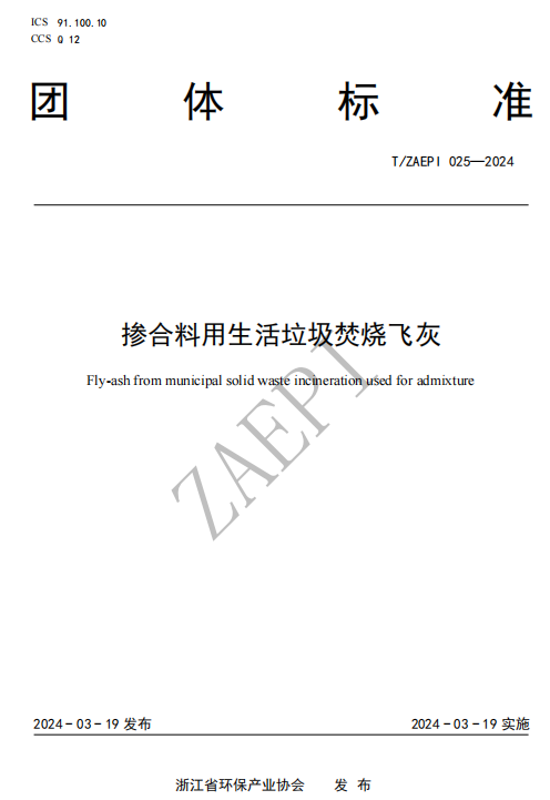 《摻合料用生活垃圾焚燒飛灰》標準號T/ZAEPI 025-2024,該標準由浙江京蘭環(huán)保科技有限公司和浙江大學主編,由浙江省環(huán)保產(chǎn)業(yè)協(xié)會于2024年3月19日批準發(fā)布,2024年3月19日起實施。文件規(guī)定了摻合料用生活垃圾焚燒飛灰的術(shù)語和定義、技術(shù)要求、試驗方法、檢驗規(guī)則、包裝、標志、運輸和貯存。文件適用于低溫熱分解及水洗解毒工藝處理后符合 HJ 1134規(guī)定的摻合料用生活垃圾焚燒飛灰,為后續(xù)飛灰處理產(chǎn)物的產(chǎn)品化進一步拓寬了應用場景。