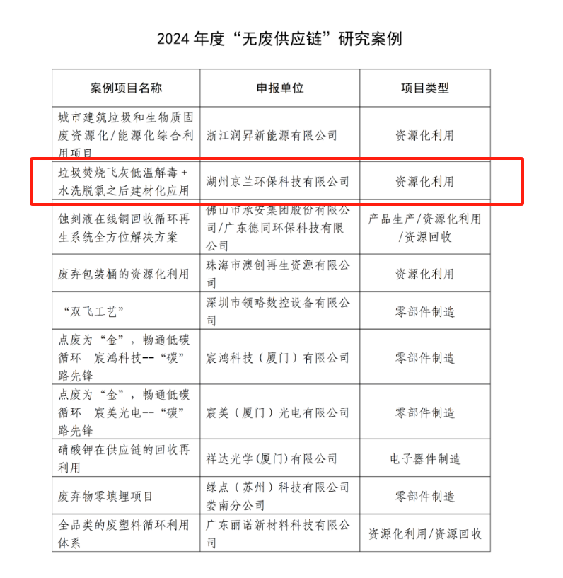 根據(jù)案例研究及匯報情況,本年度評選出10項“無廢供應(yīng)鏈”評價試點及10項“無廢供應(yīng)鏈”研究案例。湖州京蘭環(huán)保科技有限公司憑借 “垃圾焚燒飛灰低溫解毒 + 水洗脫氯之后建材化應(yīng)用” 項目脫穎而出,成功入選 “無廢供應(yīng)鏈” 研究案例。